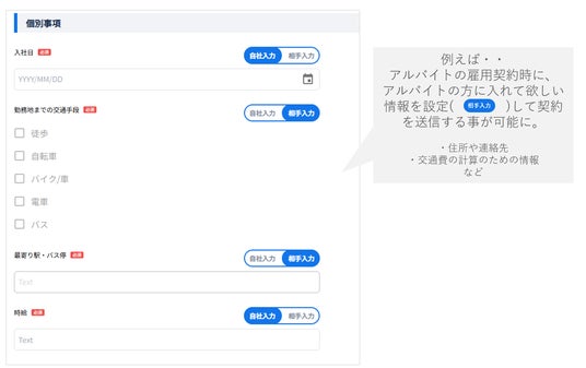 この機能はアルバイトの労働契約やフリーランスの業務委託契約など、さまざまな契約シーンで活用可能であり、契約締結までの時間を短縮し、契約プロセス全体の効率化を実現します。