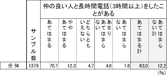 ・「仲の良い人と長時間電話(3時間以上)をしたことがある」と回答した大学生は83.0%と約8割。