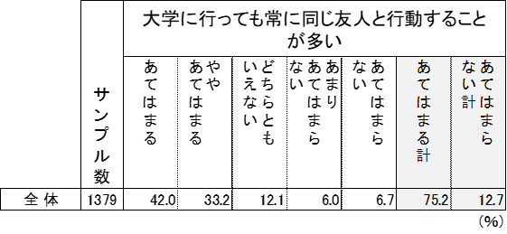 ・「大学に行っても常に同じ友人と行動することが多い」と回答した大学生は75.2%と約7割。