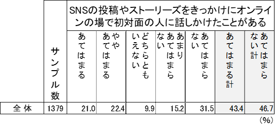 ・「SNSの投稿やストーリーズをきっかけにオンラインの場で初対面の人に話しかけたことがある」と回答した