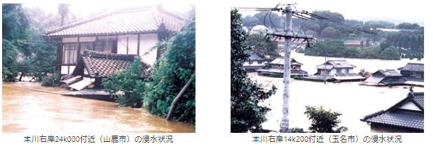 熊本県北部に位置する玉名市には、幹川流路延長71km、流域面積996kmの一級河川『菊池川』が市の中心に流れています。菊池川流域の年間の降雨量は約1,300~2,700mm。6・7月の梅雨期の降水量は、年間降雨量の1/3~1/2にも及びます。過去に菊池川で発生した洪水は、前線性によるものが70%、大洪水は全て前線性に起因しています。過去の洪水記録を見ると、古くは天安2年(西暦858年)の記録が残っており、近年では昭和28年、昭和57年、平成2年に洪水があり、特に平成2年は史上まれにみる大洪水となりました。