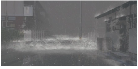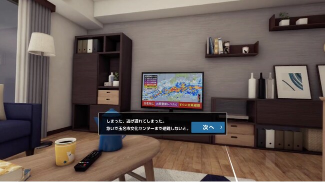 本防災VRコンテンツは、玉名市松木南児童公園付近の自宅にいるシーンから始まります。外は大雨、テレビからは大雨警戒レベル4の避難指示がでている状況の中、玉名市の災害時一時避難場所及び垂直避難建物に指定されている『玉名市文化センター』を目指して避難する過程を疑似体験できる構成です。
