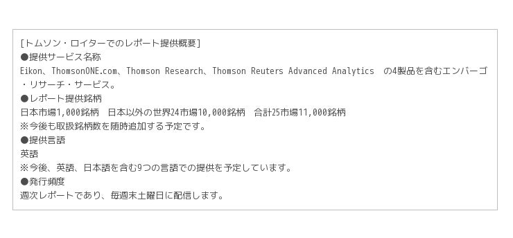 同レポートは、世界中の金融機関、事業法人をはじめとする専門家の皆様をクライアントに有する世界最大級の情報ベンダー、トムソン・ロイター社が提供するエンバーゴ・リサーチ・サービス――Eikon、ThomsonONE.com、Thomson Research、Thomson Reuters Advanced Analyticsの4製品――を配信基盤として全世界へ配信しています。サービス開始当初は、中小型株で、かつ、アナリスト評価の対象となり得るような流動性の高い人気銘柄を中心に英語版から提供いたします。