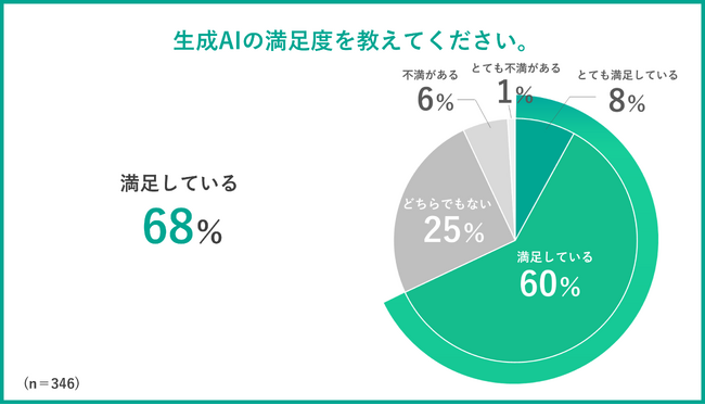 生成AI利用者の中の約3分の2にあたる68%(「とても満足している」(8%)+「満足している」(60%))が「生成AIに満足している」と回答。不満があると答えたのは7%(「とても不満がある」(1%)+「不満がある」(6%))で、1割未満に留まりました。生成AIの活用は概ね期待どおり、または、それ以上の成果を得られていると言えるでしょう。