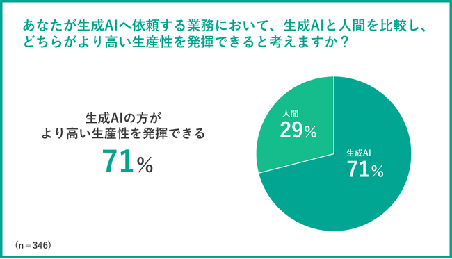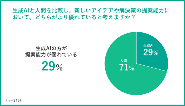 続いて、1.生産性 2.新しいアイデアや解決策の提案能力 3.業務上の相談相手、の3つの観点から生成AIと人間のどちらに優位性があると思うか質問したところ、1.の生産性については、71%が「生成AIの方がより高い生産性を発揮できる」と回答した一方で、2.の新しいアイデアや解決策の提案能力は「生成AIの方が優れている」と回答した方が29%に留まりました。なお、3.の「業務上の相談相手」については「生成AIの方が適している」と回答した方が27%と、約3割の方が業務上の相談相手として上司や同僚より生成AIを優先していることが分かりました。
