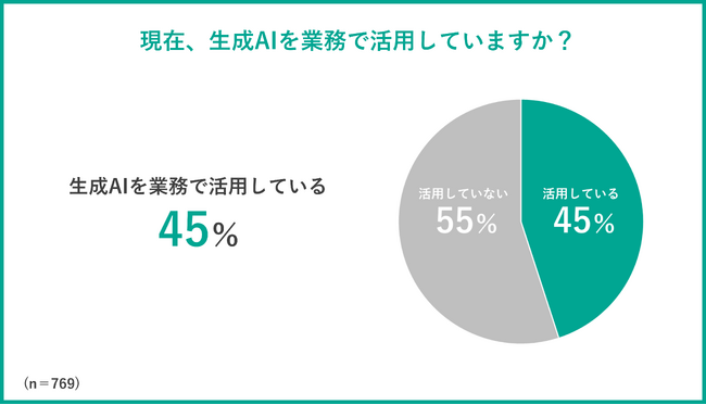 ハイクラス人材に「生成AIの業務活用」について質問したところ、全体の45%が「活用している」と回答しました。年齢別に見ると、20~30代の活用が最も多く(52%)、年齢が上がるにつれて活用率が低下しているものの、60代以上でも約4割に上りました。幅広い年代に満遍なく普及していることが伺えます。