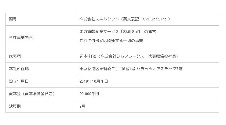 新会社は、従来のSkill Shift(https://www.skill-shift.com/)の運営を引き継ぎ、さらに強化するとともに、みらいワークスの有する数多くのプロフェッショナルとの連携を行うことで、さらなるイノベーションを地方中小企業に創出する起点としての役割を果たしていきます。