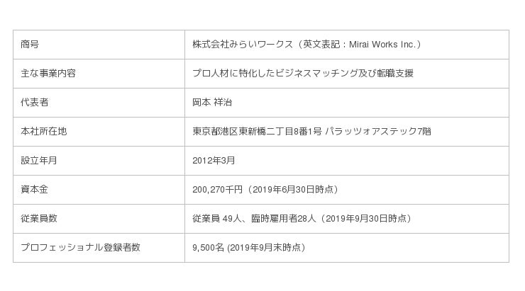 「日本のみらいの為に挑戦する人を増やす」の経営理念の下、独立・起業・転職をワンストップで提供するプラットフォームとして、プロフェッショナル人材に特化したビジネスマッチングサービスおよび転職支援事業を展開。2017年12月に東証マザーズに上場。登録プロフェッショナル人材9,500名(2019年9月末時点)、クライアント数460社(2019年9月末時点)。