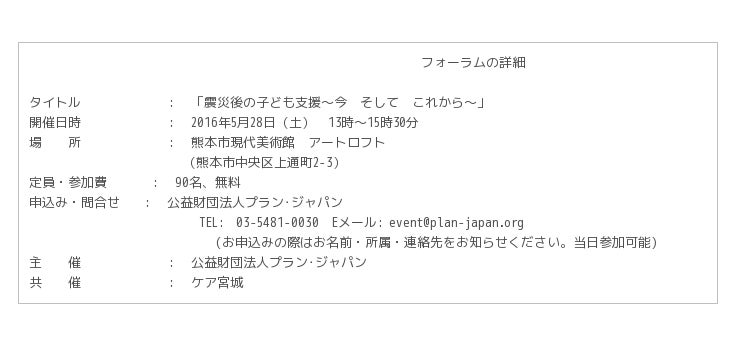 国際NGOプラン・ジャパンは、2016年5月28日(土)、熊本市現代美術館アートロフトにて、「震災後の子ども支援~今 そして これから」を開催します。熊本地震から1ヶ月。余震のおそれが残るなか、未だに不安な生活を余儀なくされている子どもたちが大勢います。フォーラムでは、東日本大震災の支援に関わった心理の専門家とプランの担当者などが登壇します。子ども支援に関わる人々や被災者の心理面への配慮に関心をもつ人々が集り、情報交換を行ないながら、今そして今後何をすべきかを考える機会です。