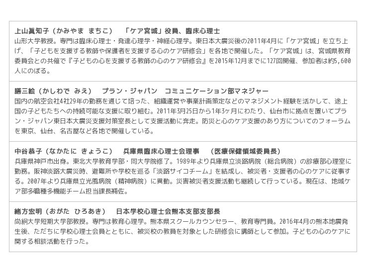 ケア宮城役員で山形大学教授の上山眞知子氏からは、レジリエンス(回復力)に着目して人々のつながりを大切に支え合う、生活に根ざした災害時の心のケア支援について紹介があります。プラン・ジャパンの膳三絵は支援における国際的な基準と実践について、兵庫県臨床心理士会理事の中谷恭子氏は阪神淡路大震災や東日本大震災で子どもたちを見守った体験から、熊本の子どもたちの支援ニーズなどについての話題提供を行ないます。日本学校心理士会熊本支部の緒方宏明氏からは、熊本の子どもたちの状況と今後の見通しなどについてお話を伺う予定です。