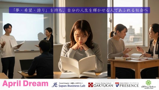株式会社ジャパンビジネスラボでは、キャリアデザインスクール「我究館」、語学コーチングスクール「プレゼンス」そして人生の幸福度を高める「ウェルビーイング・アカデミア」の事業を通じて、人生を輝かせるサポートを展開しています。