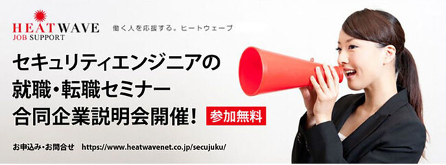 ヒートウェーブ株式会社(本社:東京都新宿区 代表取締役 林田かおる)は、セキュリティエンジニア向けのオンライン合同企業説明会とキャリアップセミナーを2023年9月14日にオンラインにて開催します。今後益々需要が高まる、セキュリティエンジニアに興味がある方、キャリアの向上を目指している方等にとっては絶好の機会です。
