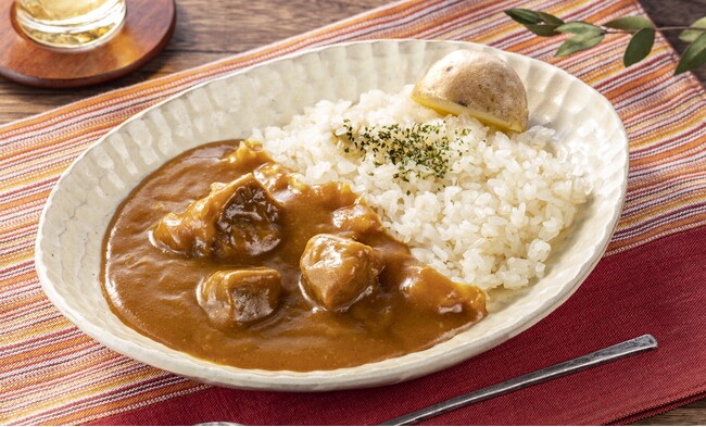 じっくり煮込んだ牛肉の旨味、玉ねぎの甘みと程よい酸味、あとからじわじわ追いかけてくるスパイスの刺激にこだわってお店の味を再現しました。ホクホクの食感に蒸したジャガイモ、バターライスと欧風カレーの絶妙なハーモニーをお楽しみいただけます。