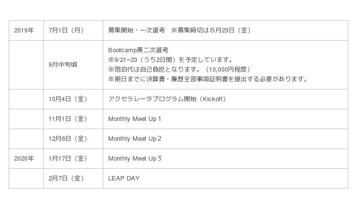 Bootcamp兼二次選考、Kickoff、Monthly Meet Up、LEAP DAYといったイベントに原則参加すること(可能な限り代表者が参加すること)