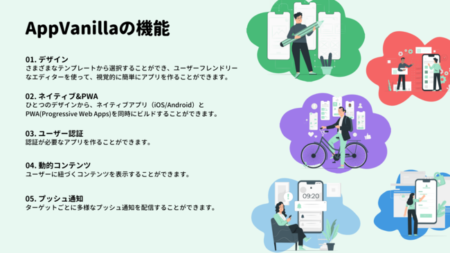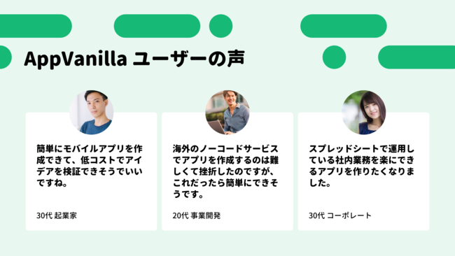 モバイルアプリ開発では、実際にアプリを利用するユーザーにとって便利でユニークな体験を生み出し、その体験をアップデートしていくことが重要です。しかし、実際には外部の開発会社に発注するなど、ユーザーと開発者の距離が遠く、ユーザーニーズを拾えないアプリが開発されているのが現状です。「AppVanilla(アップバニラ)」を利用し、低コストで高速のモバイルアプリ開発をユーザー自ら実践いただくことで、誰でもモバイルアプリを作り出せ、誰でもモバイルアプリでイノベーションを起こせる世の中の実現に貢献していきます。
