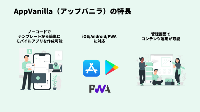 「AppVanilla(アップバニラ)」はノーコードで超高速に定額でモバイルアプリを作成できるサービスです。プログラミングをしなくても、デザイン、データ作成、公開、ビルド、ストア配布ができ、誰でもモバイルアプリを作成できます。