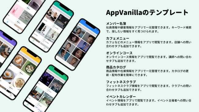 作成できるアプリの種類: メンバー名簿、カフェメニュー、フィットネスクラブ、商品カタログ、イベントカレンダーなど