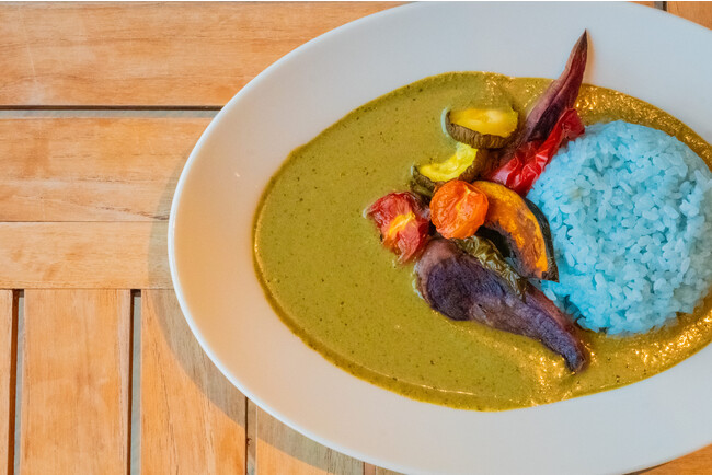 ・バタフライピーブルーライスと旬の焼き野菜たっぷりユーグレナグリーンカレー