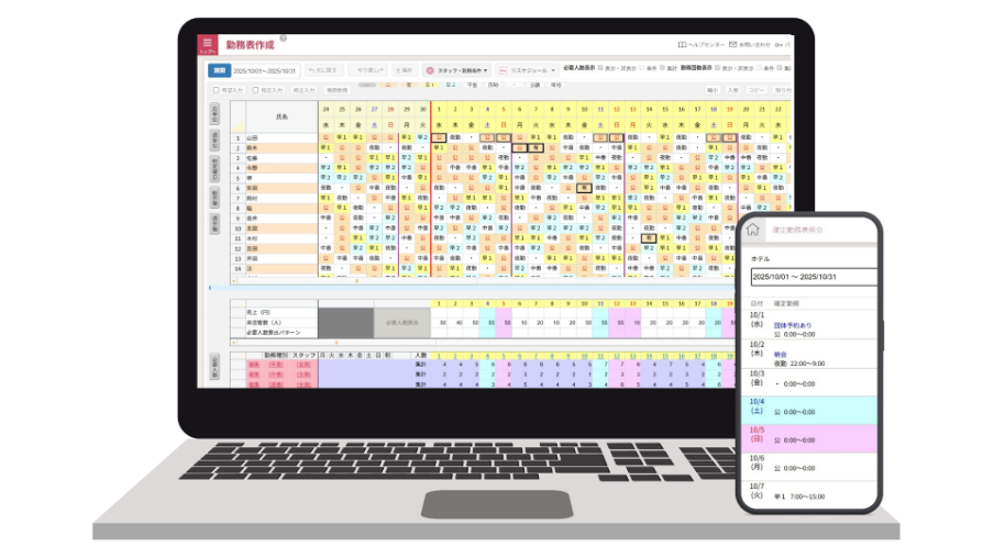 最適化AI によりスタッフの希望や勤務条件を反映したシフト表を自動で作成することができ、法令遵守や働きや すさを考慮したシフト表を、誰でも簡単に作成することができます。