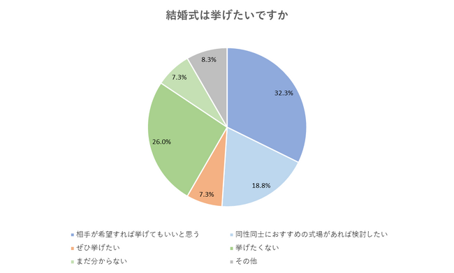 すると、もっとも多かったのは、相手が希望すれば結婚式を挙げてもいいと思う(32.3%)となり、挙げたくない(26.0%)と回答した人を上回る結果となりました。