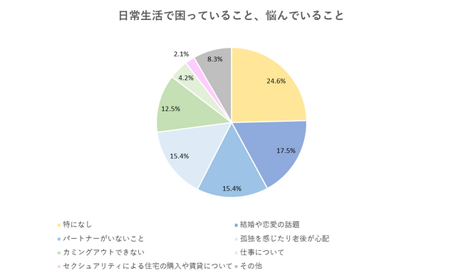 また、会員属性上、関東圏や関西圏の回答者が多いため、それ以外の地域については明確ではありませんが、社会との接点や慣習などの部分で、当事者がなかなかカミングアウトしづらい環境にあり、一人で悩みを抱えてしまう状況があるのではないでしょうか。