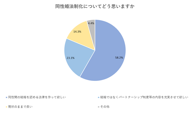約6割の方が、「同性間の結婚を認める法律を作って欲しい」と回答しました。また、23.1%は「結婚ではなくパートナーシップ制度等の内容を充実させて欲しい」と回答しています。約8割の方が何らかの変化を求めているようです。