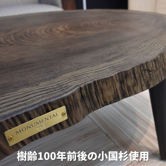 こちらのテーブルは樹齢のプレートをおつけします見えにくいですが、この黒っぽい板は樹齢110年の樹を使ってます。