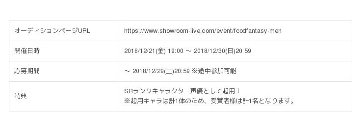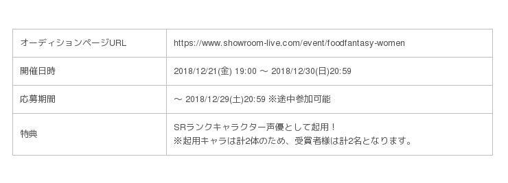 この度、新キャラクターの登場にあたり、話題のライブ配信空間「SHOWROOM」にて『Food Fantasy』新キャラクターの声優オーディションを開催いたします。受賞者様には、登場キャラクター声優として起用させて頂きます。