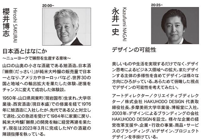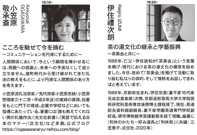 今回は、1.小笠原流礼法宗家の小笠原敬承斎、2.茶道総合資料館副館長、裏千家学園茶道専門学校副校長の伊住禮次朗、3.日本酒「獺祭」を製造する旭酒造株式会社会長の櫻井博志、4.アートディレクターで株式会社HAKUHODO DESIGN代表取締役社長の永井一史の4名が登壇。ここでしか聴くことのできない、本企画限定の貴重なトークをお楽しみいただけます。