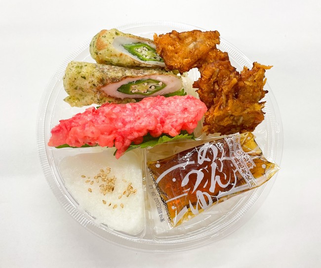 『こんにゃく麺 オクラ磯辺揚のおろしぶっかけ』は、暑い夏にうどんや素麺など麺類に食べ飽きてきた方におススメの一品です。主原料が蒟蒻の平打ち麺で、蒟蒻やしらたきにありがちな独特な臭いがないため食べやすく、プリプリとした食感で噛み応えも抜群です。茹でうどんと比べて低カロリーで低糖質なので、その分トッピングでお楽しみいただけるよう工夫しました。夏野菜のオクラが入った磯辺揚や、さっぱりとした紅生姜の衣で揚げた蓮根天ぷら、一味入りでピリっと辛いごぼうちぎりを、大根おろしとまぜてぶっかけ麺に。見た目にも夏らしい彩りの一品に仕上げています。