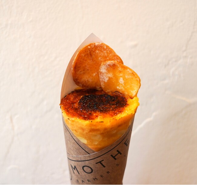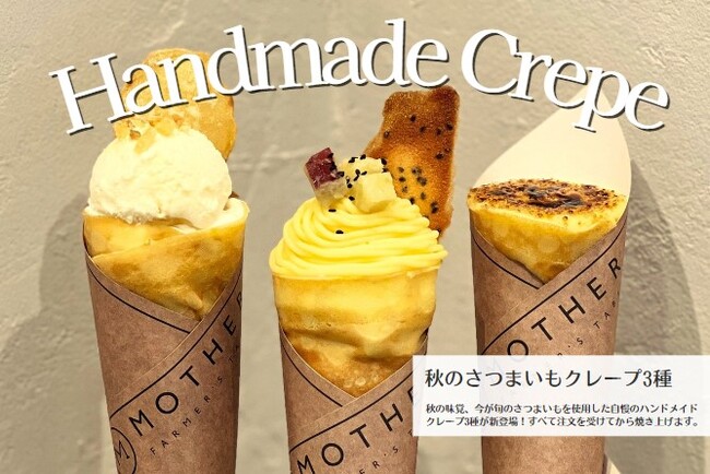 昨今人気となっている”蜜芋“タイプのさつまいも「紅はるか」を使用したクレープ3種が登場!食味や芋の外観が他品種よりも「はるか」に優れていることから由来し、その名がついた紅はるかは蜜芋の王様。マザー特製ハンドメイドクレープの生地との相性も抜群です!