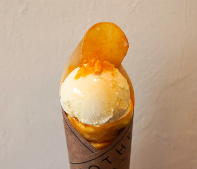自家製のさつまいもペーストをふんだんに使用してキャラメリゼしたクレープ。さつまいもと塩味のある芋けんぴ、黒蜜とホイップのマリアージュや、キャラメルの薄いカリカリ食感をお楽しみください。