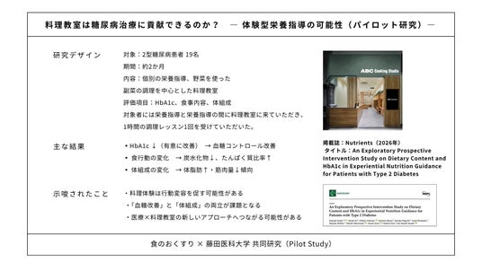 株式会社食のおくすり(代表取締役:佐野こころ、以下「当社」)は、藤田医科大学と共同で、「料理教室を取り入れた体験型栄養指導」が2型糖尿病患者に与える影響を検証する研究を実施しました。