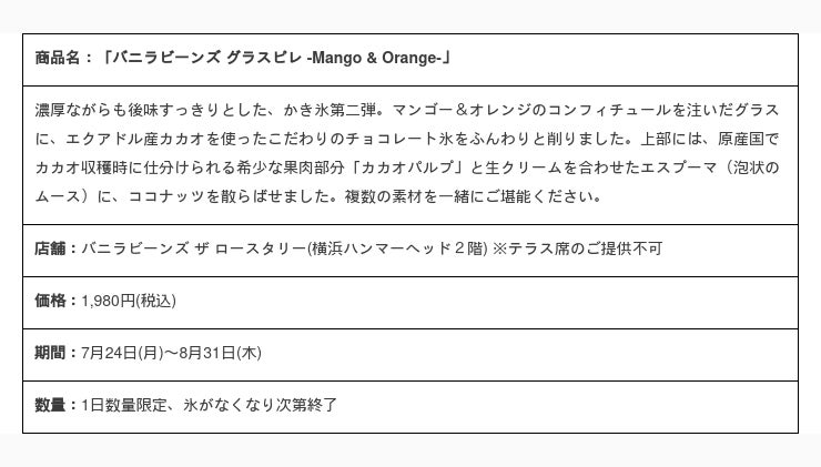 チョコレートデザイン株式会社(代表取締役:八木克尚、本社所在地:横浜市)が運営するブランドVANILLABEANS(バニラビーンズ)は、横浜ハンマーヘッド内の店舗「VANILLABEANS THE ROASTERY(バニラビーンズ ザ ロースタリー)」限定のかき氷第二弾「グラスピレ -Mango & Orange-」を7月24日(月)から販売します。