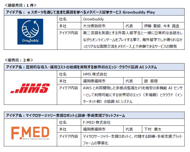 「最優秀賞」はGrowbuddy(グロウバディ)(本社:別府市、代表:伊藤 愛留、今本 昌浩)、「優秀賞」はHMS株式会社(本社:福岡市、代表:胡 振程[James HU])およびF.MED(エフメッド)株式会社(本社:福岡市、代表:下村 景太)です。