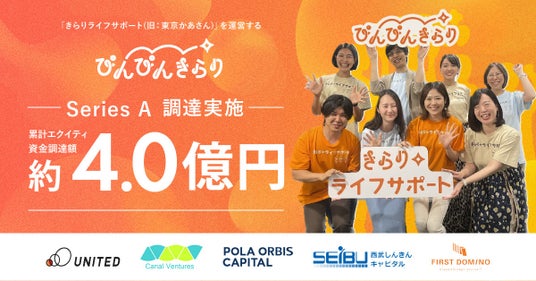 総合的にご家庭をサポートする「きらりライフサポート(旧:東京かあさん)」を運営する株式会社ぴんぴんきらり(本社:東京都品川区、代表取締役CEO:喜多尾 衣利子、以下当社)は、ユナイテッド株式会社、株式会社ポーラ・オルビスホールディングス、キャナルベンチャーズ株式会社、西武しんきんキャピタル株式会社、FIRST DOMINO株式会社、個人投資家を引受先とした第三者割当増資により、シリーズA総額約1.5億円の資金調達を実施したことをお知らせいたします。累計資金調達額は約4億円となります。