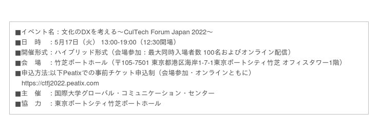 デジタルトランスフォーメーション(DX)の包括的な社会実装に資する研究と実践活動を進める国際大学グローバル・コミュニケーション・センター(GLOCOM)は、来る5月17日に「文化のDX」領域について議論する大型学術イベント「文化のDXを考える~CulTech Forum Japan 2022~」を東京都港区の竹芝ポートホールにて開催いたします。