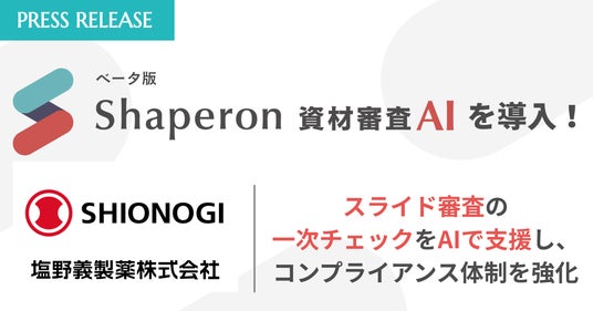 株式会社シャペロン(本社:東京都世田谷区、代表取締役:阪本 怜)が提供する「Shaperon資材審査AI(ベータ版)」を、塩野義製薬株式会社(本社:大阪府大阪市、代表取締役会長兼社長 CEO :手代木 功)に導入いただきました。