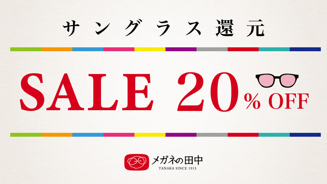 お出かけや旅行が増えそうな今年の夏ですが、サングラスは、夏のファッションだけでなく、目の紫外線対策としても、ぜひ取り入れていただきたいマストアイテムです。そこで7~8月は、お客様感謝企画の一環として、メガネの田中全店で、サングラス対象商品20%OFF還元セールをいたします。