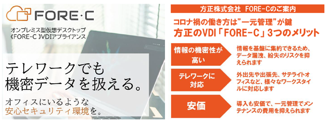 【FORE-C(フォーシー)】は仮想的デスクトップサーバを一元管理することでオフィスと同等のセキュリティを確保し、会計処理や税務処理、研究、開発を在宅でも、可能にするソリューションです。