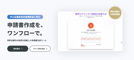 本サービスは、経済産業省が新設した「中小企業成長加速化補助金」に対応した補助金申請支援サービスであり、申請に必要な事業計画書・申請書の作成プロセスをAI技術と専門家サポートにより一気通貫で支援するものです。
