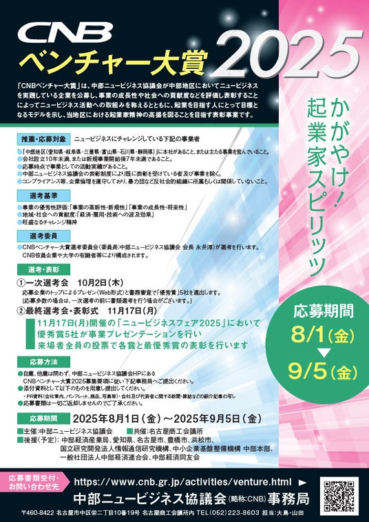 中部ニュービジネス協議会(CNB)では、革新的な新しい事業に挑戦しているベンチャー企業及び既存企業によるニュービジネスに対する表彰事業を実施します。