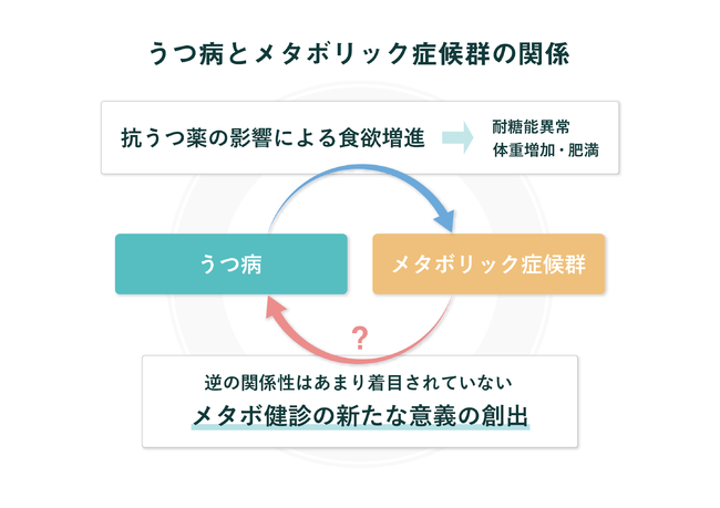 メタボ健診は元来、心臓発作や脳卒中などの心血管疾患の危険因子とされてきました。メタボ判定による早期ハイリスク群の同定によりこれらの疾患に対する予防的アプローチが向上してきました。しかし働き盛りの世代にとっては不眠、不安障害、適応障害、うつ病などの精神疾患による負荷が、一人一人の健康を害するだけでなく、労働生産性の低下などの社会的な問題もはらんでいました。また、我が国ではうつ病に対して医療機関を受診して治療を受ける割合が諸外国に比べて低いことが知られており、うつ病のリスクの高い集団を同定することが求められていました。