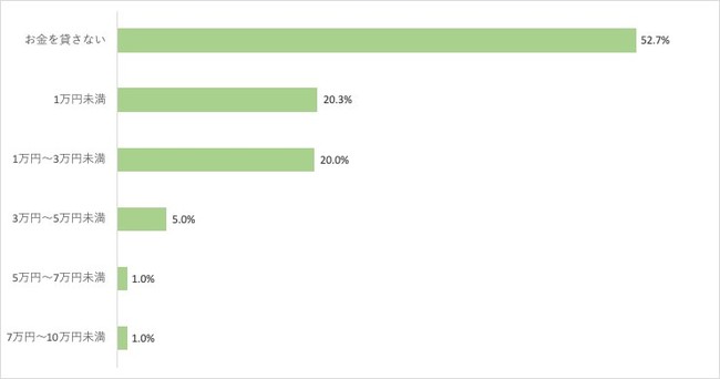 「お金を貸さない 52.7%(158人)」「1万円未満 20.3%(61人)」「1万円~3万円未満 20.0%(60人)」「3万円~5万円未満 5.0%(15人)」「5万円~7万円未満 1.0%(3人)」「7万円~10万円未満 1.0%(3人)」という結果になりました。