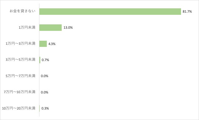 「お金を貸さない 81.7%(245人)」「1万円未満 13.0%(39人)」「1万円~3万円未満 4.3%(13人)」「3万円~5万円未満 0.7%(2人)」「5万円~7万円未満 0.0%(0人)」「7万円~10万円未満 0.0%(0人)」「10万円~20万円未満 0.3%(1人)」という結果になりました。