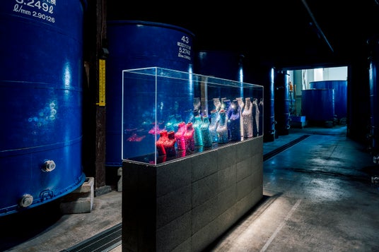 舘鼻則孝の代表作として知られている《Heel-less Shoes》は、桝田酒造店・酒造場の大きなタンクに囲まれた空間の中に陳列されています。会場設計を担当した建築家の周防貴之氏によって考案されたコンクリートブロック製の什器も本会場ならではの見どころとなっています。
