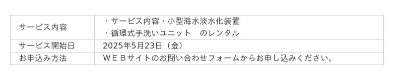 当社は、中国電力ネットワーク株式会社(広島県広島市、代表取締役社長 長谷川 宏之)と連携し、本日から、小型海水淡水化装置・循環式手洗いユニットのレンタルを行う「アクアシフト」の提供を開始します。