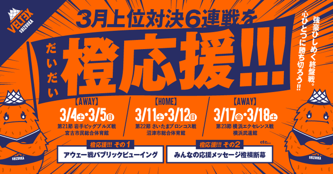 この度、ベルテックス静岡では、3月4日(土)~3月18日(土)までに開催する、岩手ビッグブルズ戦(2位)、さいたまブロンコス戦(3位)、横浜エクセレンス戦(5位)の上位対決6連戦を応援するべく『橙応援』企画を実施いたします!(順位は2/13現在)
