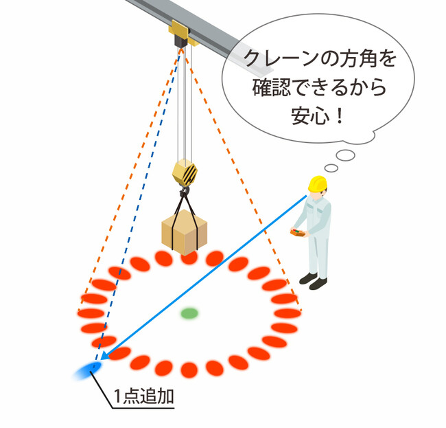 クレーン吊荷周囲の立入禁止ゾーンを可視化する点円環光の周囲に方角を示すドット光をオプション機能として追加可能です。従来、作業者はクレーン操作時に都度上方にある方角表示を確認する必要がありました。今回、オプション機能を追加することで、床面から目を離すことなく方角を確認でき、クレーンの誤操作防止になります。また、ドット光は点円環状の光や中央点の光と異なる色を選択可能です。