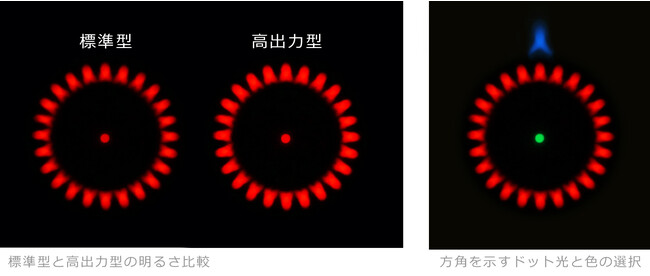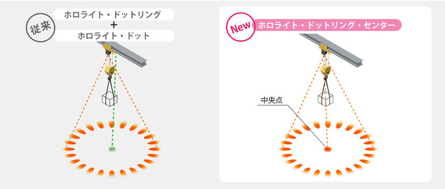 新製品「ホロライト・ドットリング・センター」および従来製品「ホロライト・ドットリング」の高出力型を開発しました。標準型と比較して、電力は2倍、明るさは1.5~2倍を実現し、15mを超える揚程のクレーンに対しても十分な視認性が得られます。